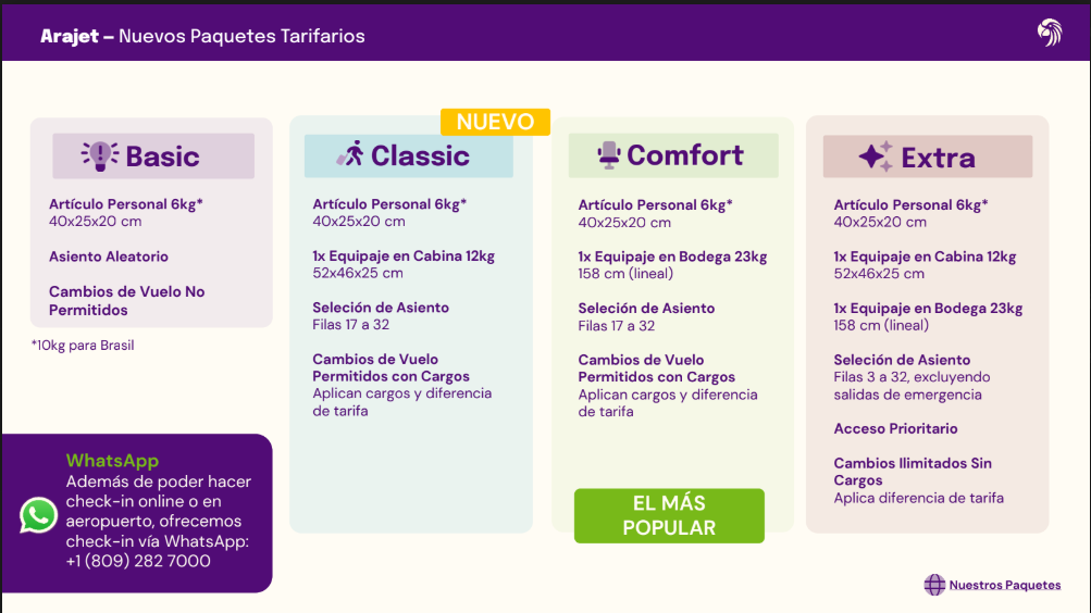 - Precios de equipaje más bajos en el aeropuerto: Las tarifas por equipaje adicional en el aeropuerto ahora son más bajas para que viajar resulte aún más fácil y conveniente.
