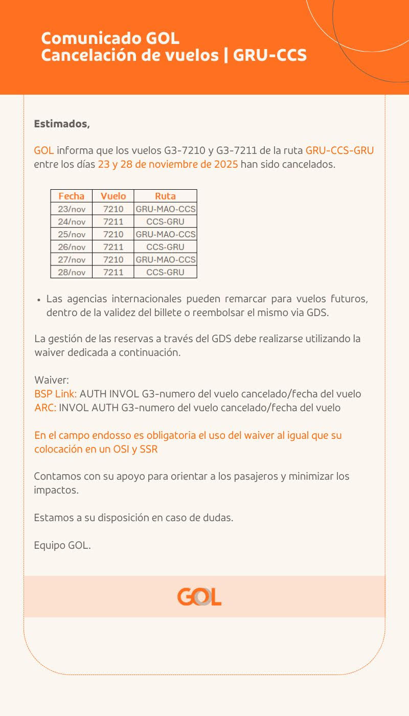 Gol Comunicado cancelación de vuelos CCS Diciembre 01, 2025 Gol Gol Linhas Aéreas Repro Policy Caracas ← Anterior Siguiente →