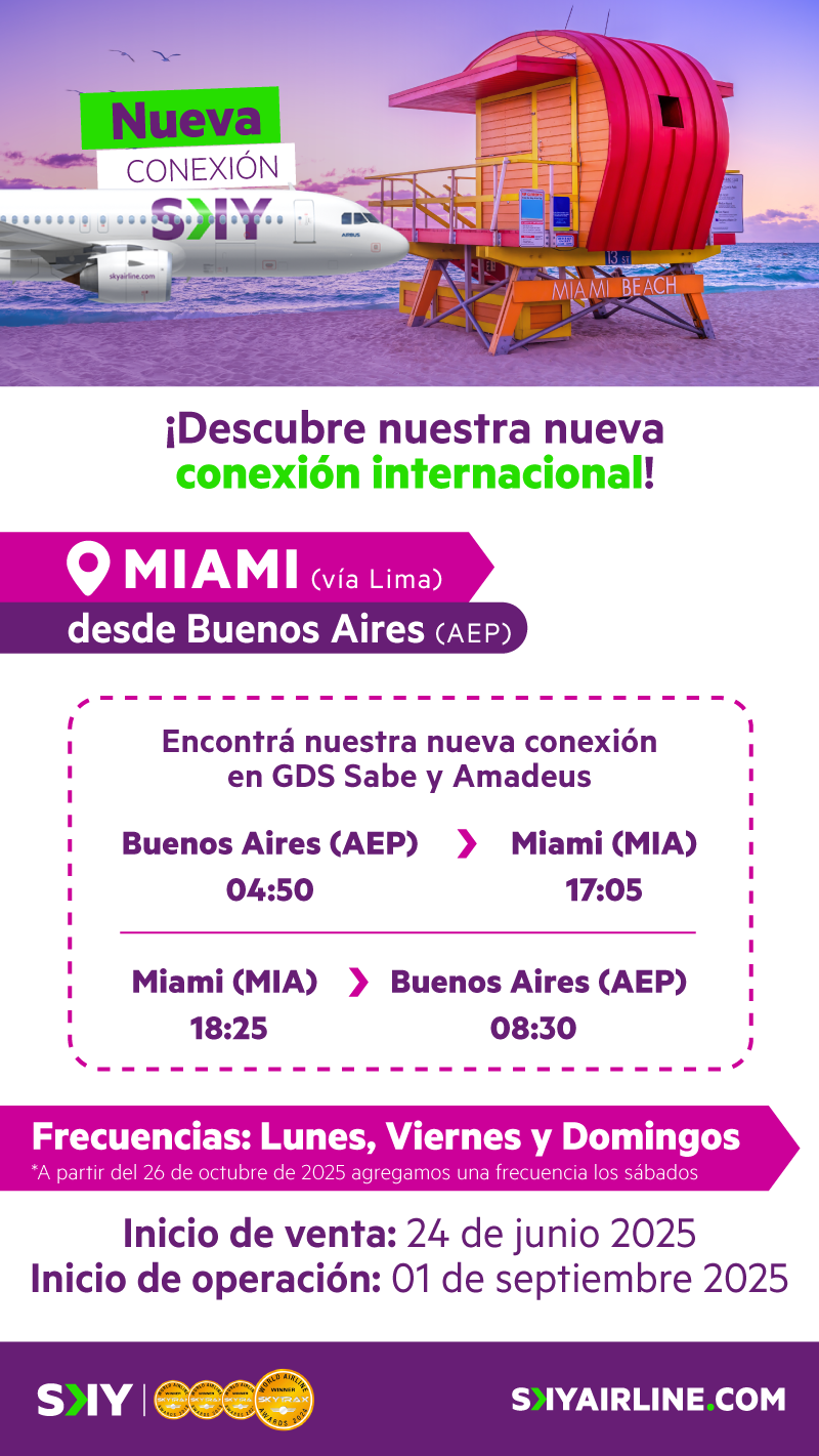Sky Airline Nueva Conexión Buenos aires (AEP) - Miami (vía Lima) Junio 26, 2025 Sky Airline Sky Nueva ruta Sky Airline ← Anterior Siguiente →